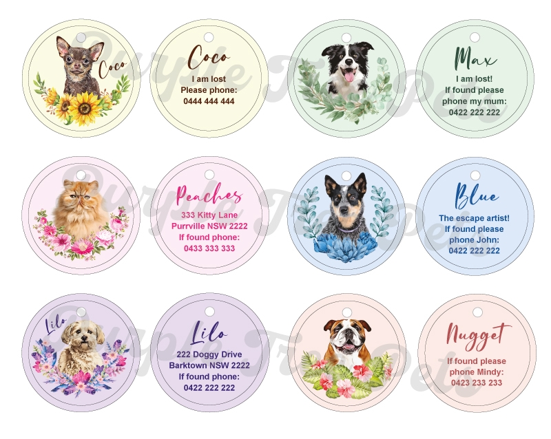 Your pets name is included on the front and 5 lines of text can be added on the back. This may include your contact name, phone number, address or anything else of importance.