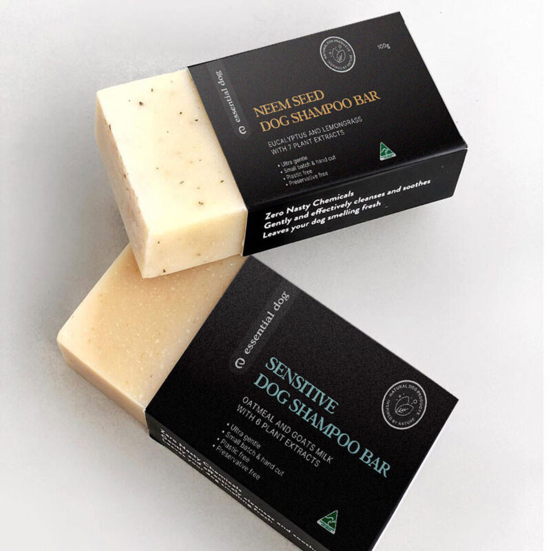 A solid dog shampoo bar idea for all skin types utilising neem, plant extracts and essential oils.