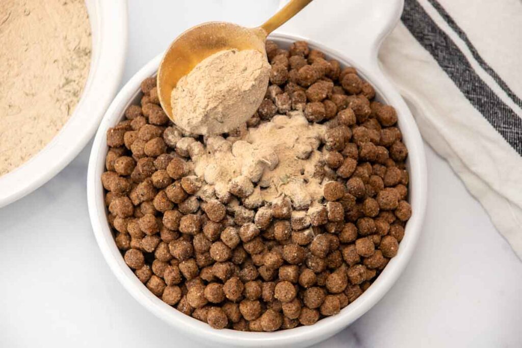 Brewer’s yeast is typically available as a powder or flakes and can be easily mixed into feed.